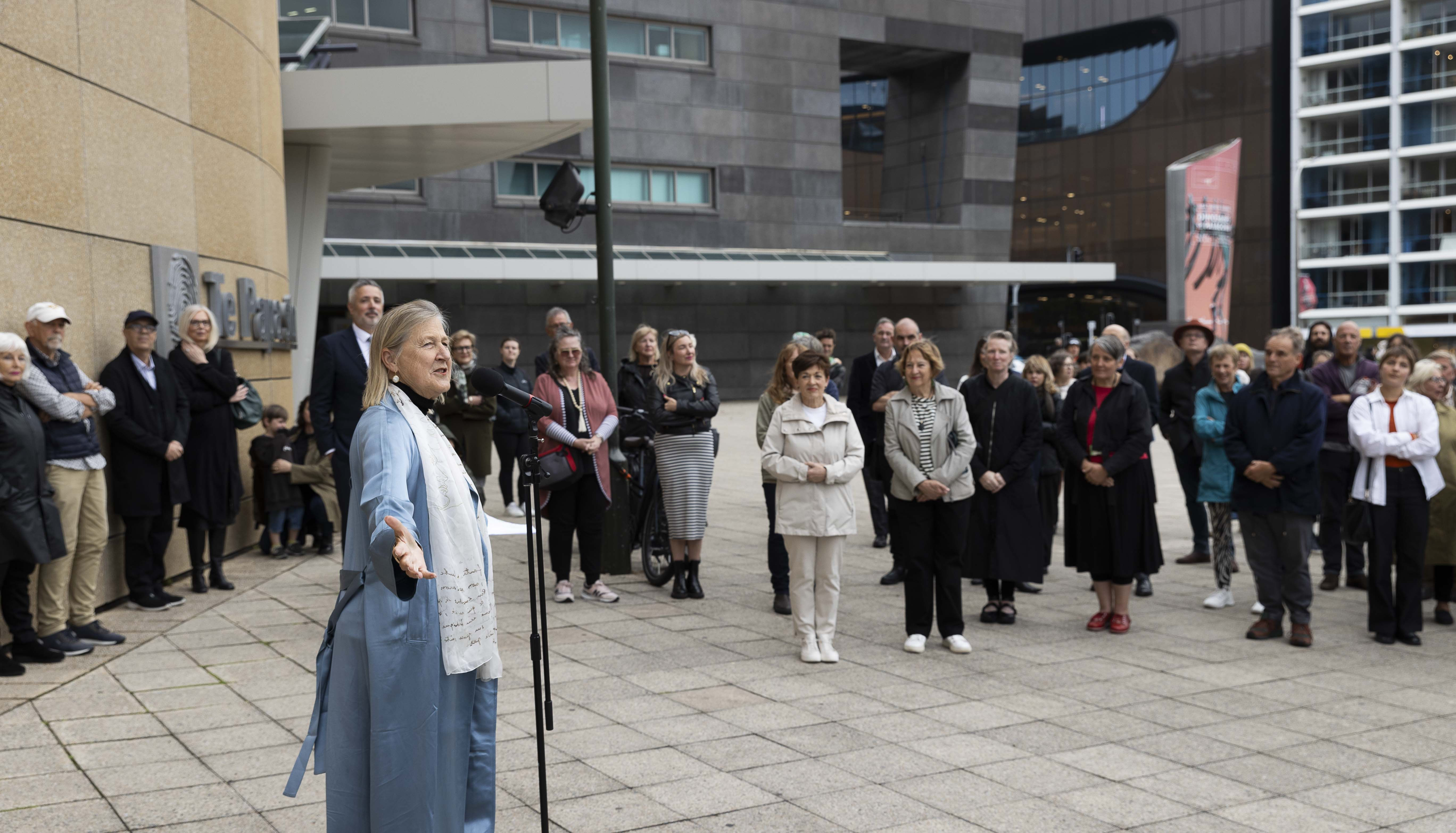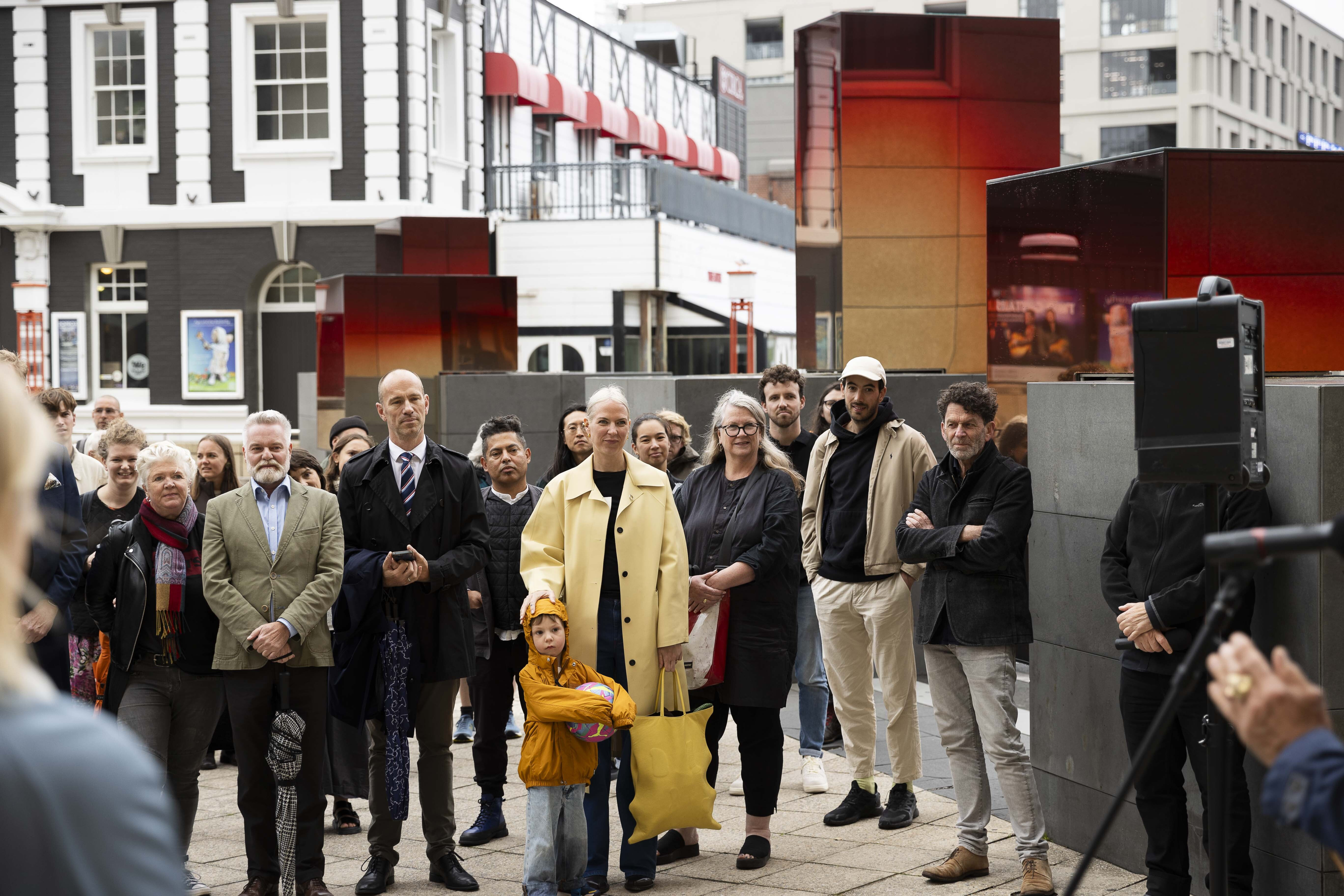 More than 100 joined Trustees on a cold but fine evening for the ‘unveiling’ of Sabine Marcelis’ beautiful work on the four plinths. Sabine, an internationally renowned designer, is the recipient of the ninth Collin Post 4 Plinths Project commission and was awarded $50,000 to realise her work, Merging Blocks. The funds are generously donated by the family of the late Collin Post.