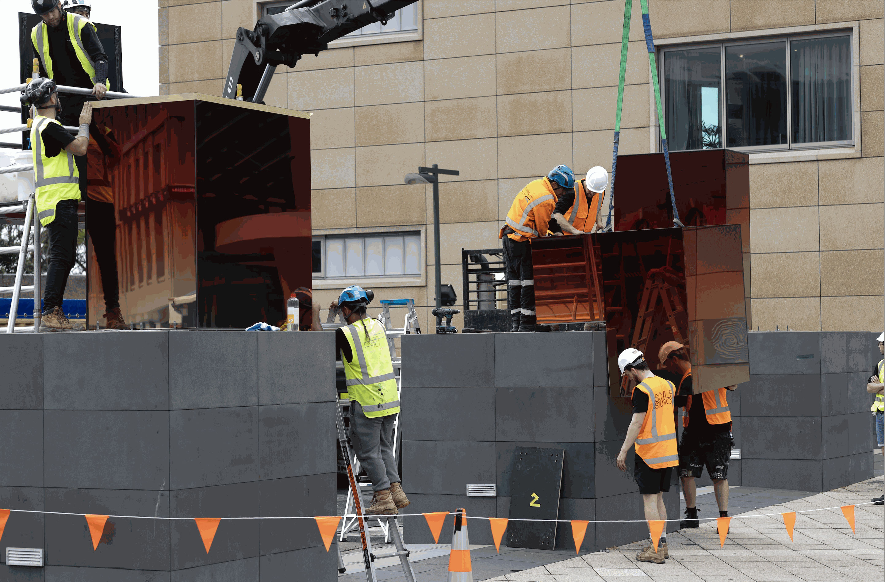 Merging Blocks (2024) marks a significant moment in Sabine’s practice, bringing an element of scale and permanency. With the four large coloured and mirrored glass volumes, in varying proportions and orientations, injecting warmth into the grey bollards and their surrounds.