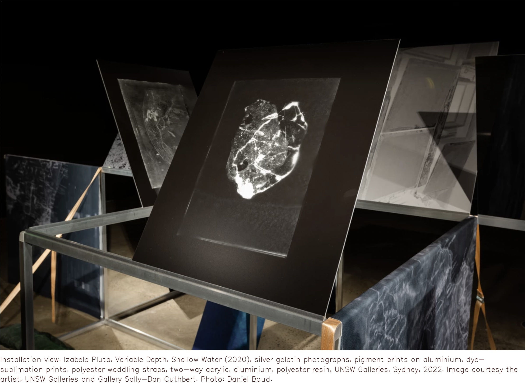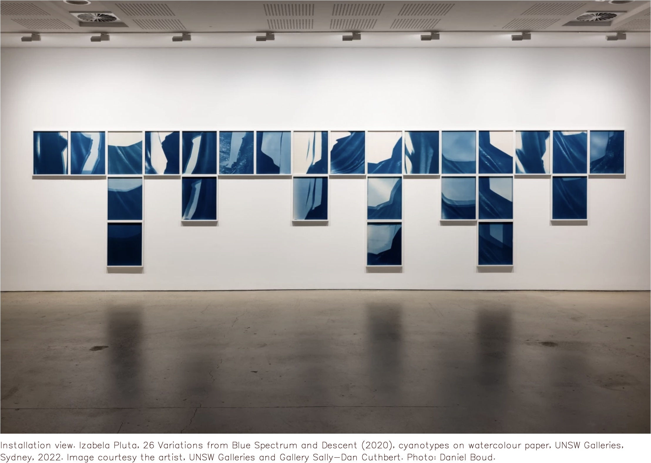 The exhibition is spread across three galleries and depending on whether you turn left or right when you enter, you’ll experience the show differently. The work that’s most haptic, and perhaps the easiest to access, is on the far wall of the left side gallery. This series, 26 Variations from Blue Spectrum and Descent (2020), is an arrangement of 26 cyanotypes made in response to a previous work, Apparent Distance (2019)—an installation displayed at AGNSW as part of The National: New Australian Art. That work, a large-scale installation of expanded photography, where images taken off Yonaguni were printed onto swathes of draped fabric, evoked the sensation and intensity of being underwater. In 26 variations, each of the 26 prints uses the cyanotype’s hallmark shadowy blue marks to gesture toward the lines and shapes of the installation, as well as the memory of the originating site. The work is both a documentation of prior work and new work—an example of how Pluta’s practice falls back in on itself. Many of her images respond to what has come before in a performance of photographic theory’s obsession with memory and reproduction. And while 26 Variations gestures back to Yonaguni, the site, now mediated through a series of displacements, becomes distant, shadowy. It haunts the image, but it is impossible to decipher. This doesn’t matter; the visual effect of the cyanotypes—the crisp edged curves, the moments where the blue shifts from brilliant to deep—is striking enough to encounter without the knowledge of the steps that led to them.