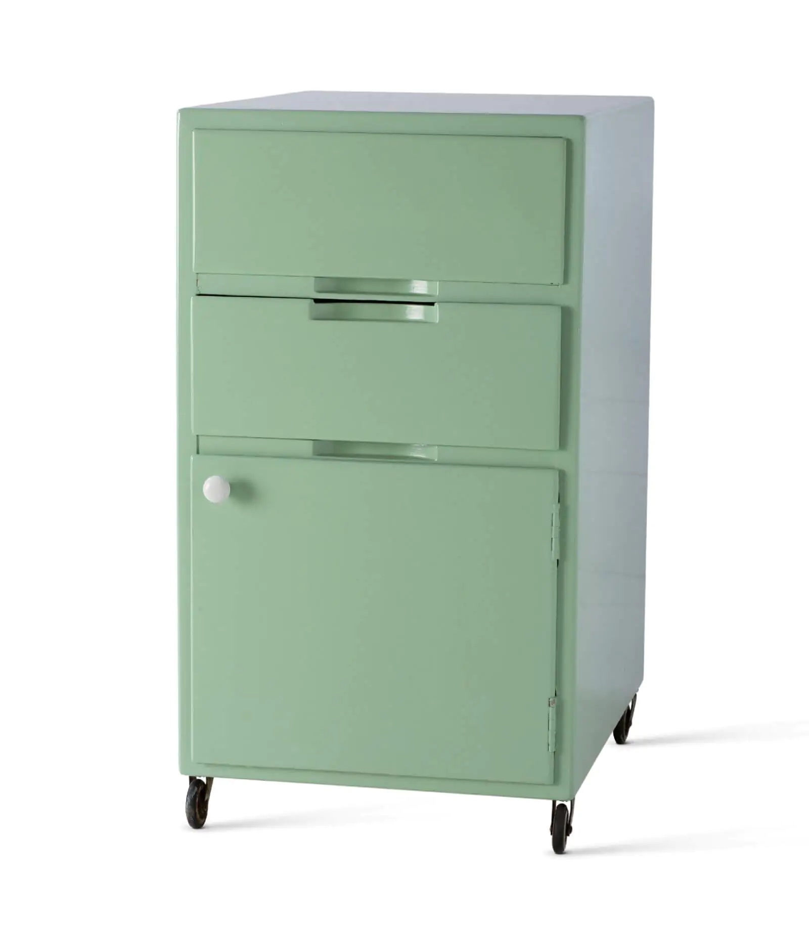 For the green section, therefore, Marcelis, who collaborated with curators Susanne Graner and Nina Steinmüller, proceeded by sequencing ‘waves’ of colour. This sees Alvar Aalto’s ‘Bedside cabinet’ (1931-1932) for the Paimio Sanatorium in soothing minty green near Ron Arad’s ‘Looming Lloyd’ (1989), a wicker armchair in painted grass green with clunky stainless steel front feet – a humorous metaphor for a wobbling person.