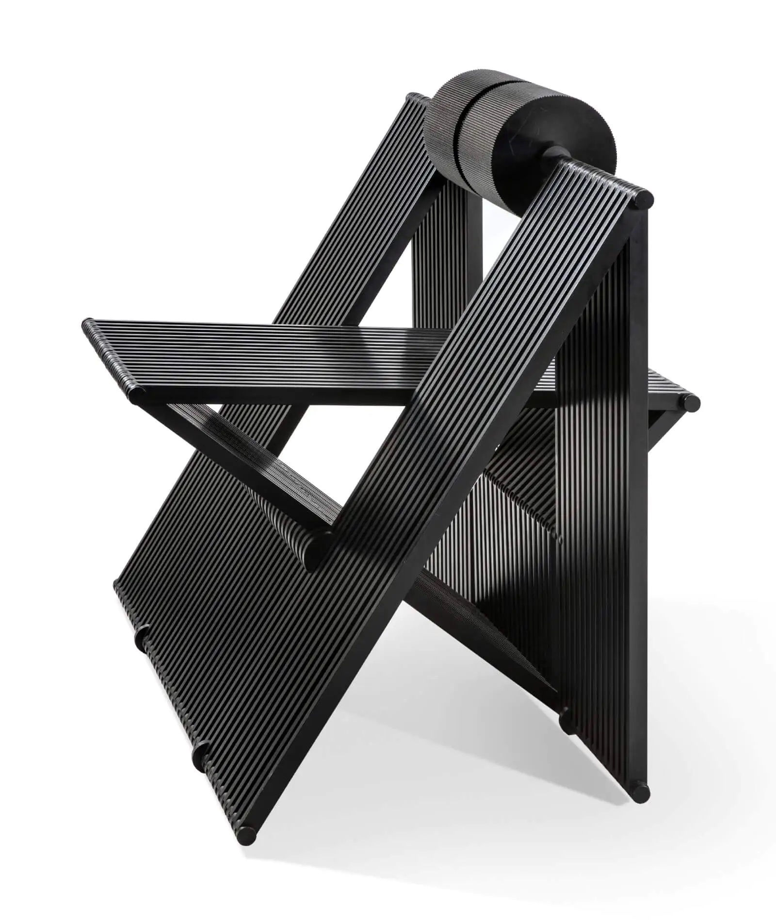 While many of the works are familiar to design enthusiasts, there are plenty of discoveries. One such highlight is Stefan Wewerka’s ‘Classroom Chair’ (1970) – a black chair slouching to one side, mimicking the gesture of a bored teenager. It contrasts with its neighbour, Mario Botta’s ‘Quarta’ (1984) – an aluminium seat pivoting out of a ribboned structure, like a transparent element in a building.