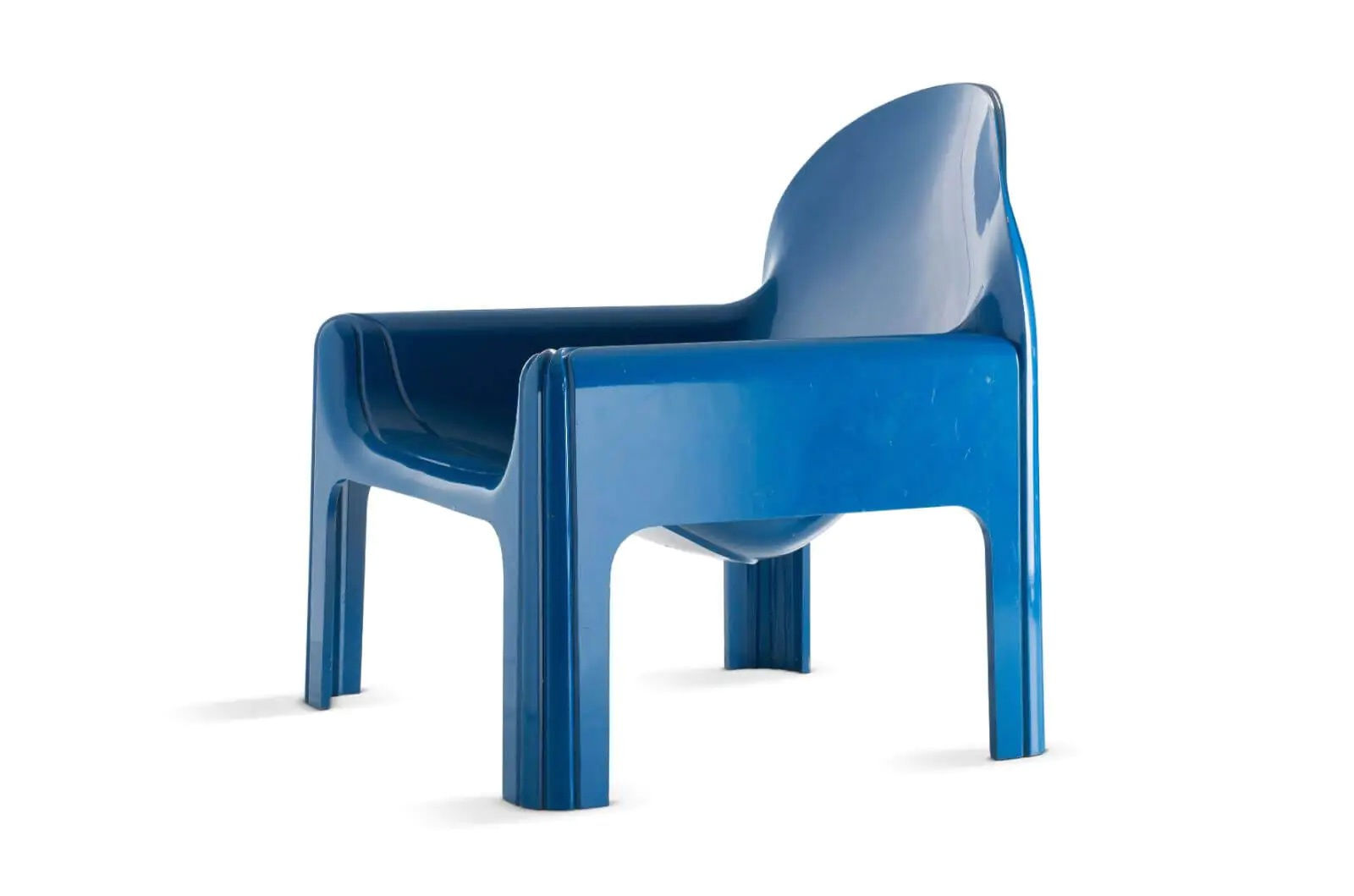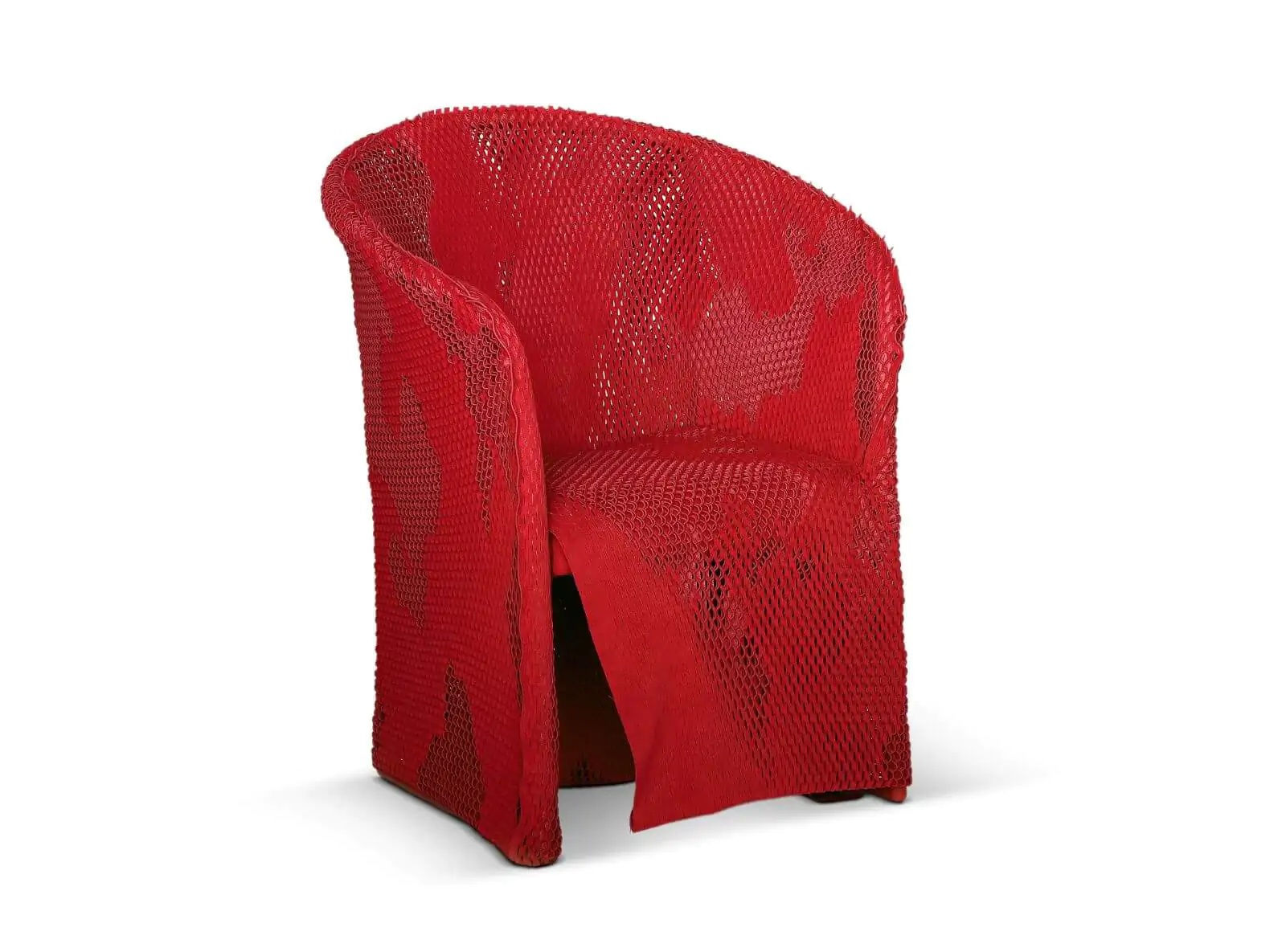 Inevitably, the red section is where one finds passionate pieces such as Studio 65’s red-lipped sofa, ‘Bocca, Marilyn’ (1970). It is in the striking company of Shiro Kuramata’s tall, sculptural ‘Revolving Cabinet’ (1970), Ettore Sottsass’s ‘Valentine’ typewriter (1969) and Tokujin Yoshioka’s experimental ‘Kimono Chair’ (2007), made of lacerated, blood-red fabric draped over a steel frame.