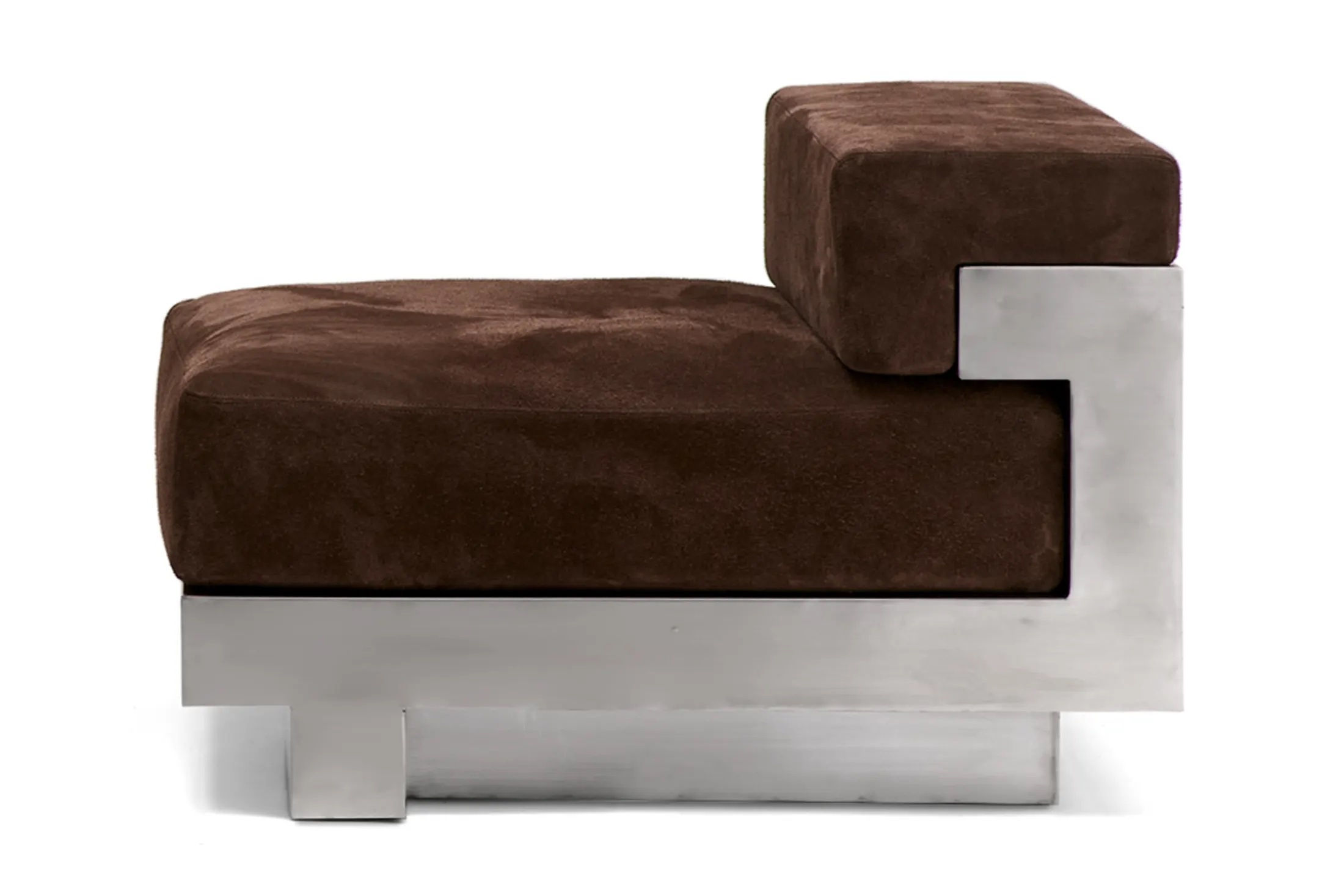 Like those bunkers, monuments and churches, the hefty sofas, tables and lamps are designed to impress but then, almost paradoxically, disappear into their landscape – at first glance intimidating, at second integrating into their environment with supreme ease. The sofas are spectacular: modular steel blocks polished to a demi-sheen topped with lush suede cushions.
