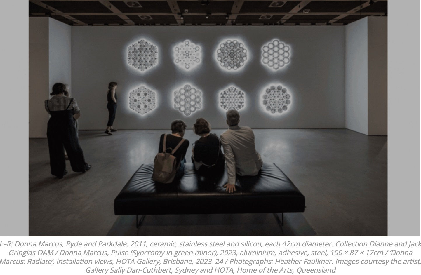 Donna Marcus’ survey exhibition Radiate at the Gold Coast’s HOTA Gallery does just that. Her use of recycled aluminium kitchenware is transformed into a biographical sketch in this exhibition, prefaced with the SS Gabo. This ship was the home of Marcus’ mother Thora as a child, progressively dismantled and sold as salvage. It’s a family story that has hovered in her imagination for decades, but has resonated particularly strongly in the last ten years. For Radiate, her own GABO, 2022–23, is eight large works constructed from aluminium which emit simmering light and tension behind their black forms.