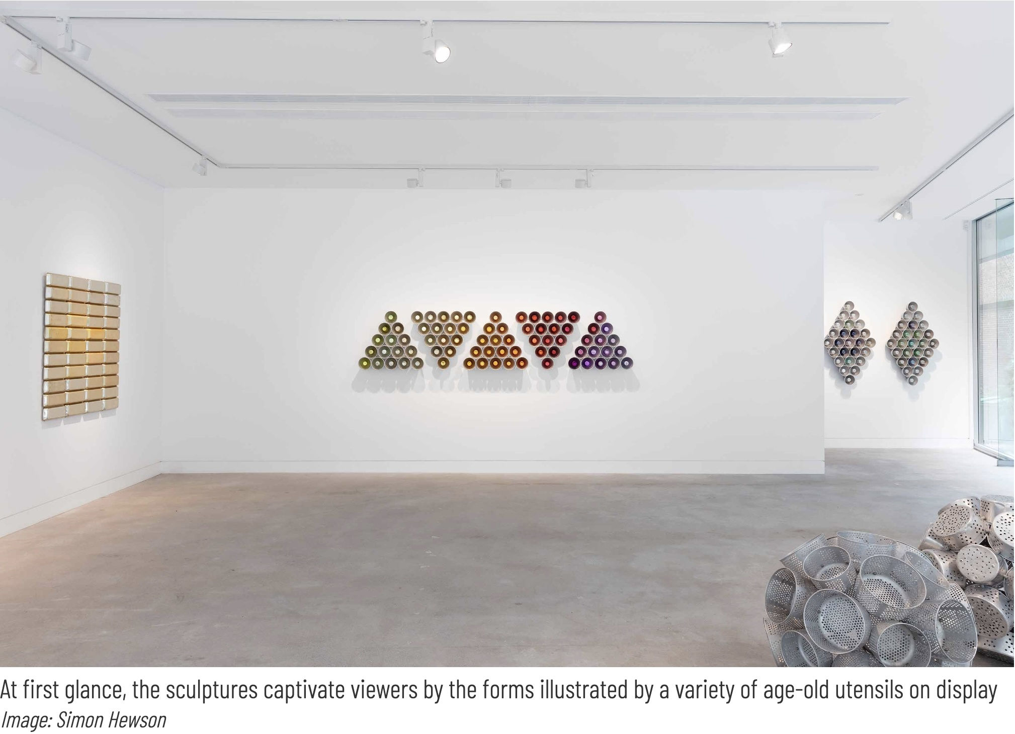 Gallery Sally Dan-Cuthbert, an Australian art gallery recently unveiled artist Donna Marcus’ first solo exhibition. Titled Pallet, the exhibit showcases a new sculpture series made of repurposed aluminium cookware. Taking over the ceiling, walls and floor, Marcus’ striking sculptures constitute simple geometric forms and arresting colour compositions that display a complex sculptural harmony and tell a nuanced narrative. While the artworks are made of everyday objects, they display modern and intriguing visual forms. Founded in 2019, Gallery Sally Dan-Cuthbert, located in Sydney, Australia, is a distinctive space that marries modern visual art with collectible design pieces by local and international artists and designers. The venue represents both upcoming and established creatives, with an aim to push boundaries and curate intriguing exhibitions. Pallet offers guests a safe space for reflection and contemplation in which they are encouraged to wander through the show at their own pace, taking in the works sensorially.