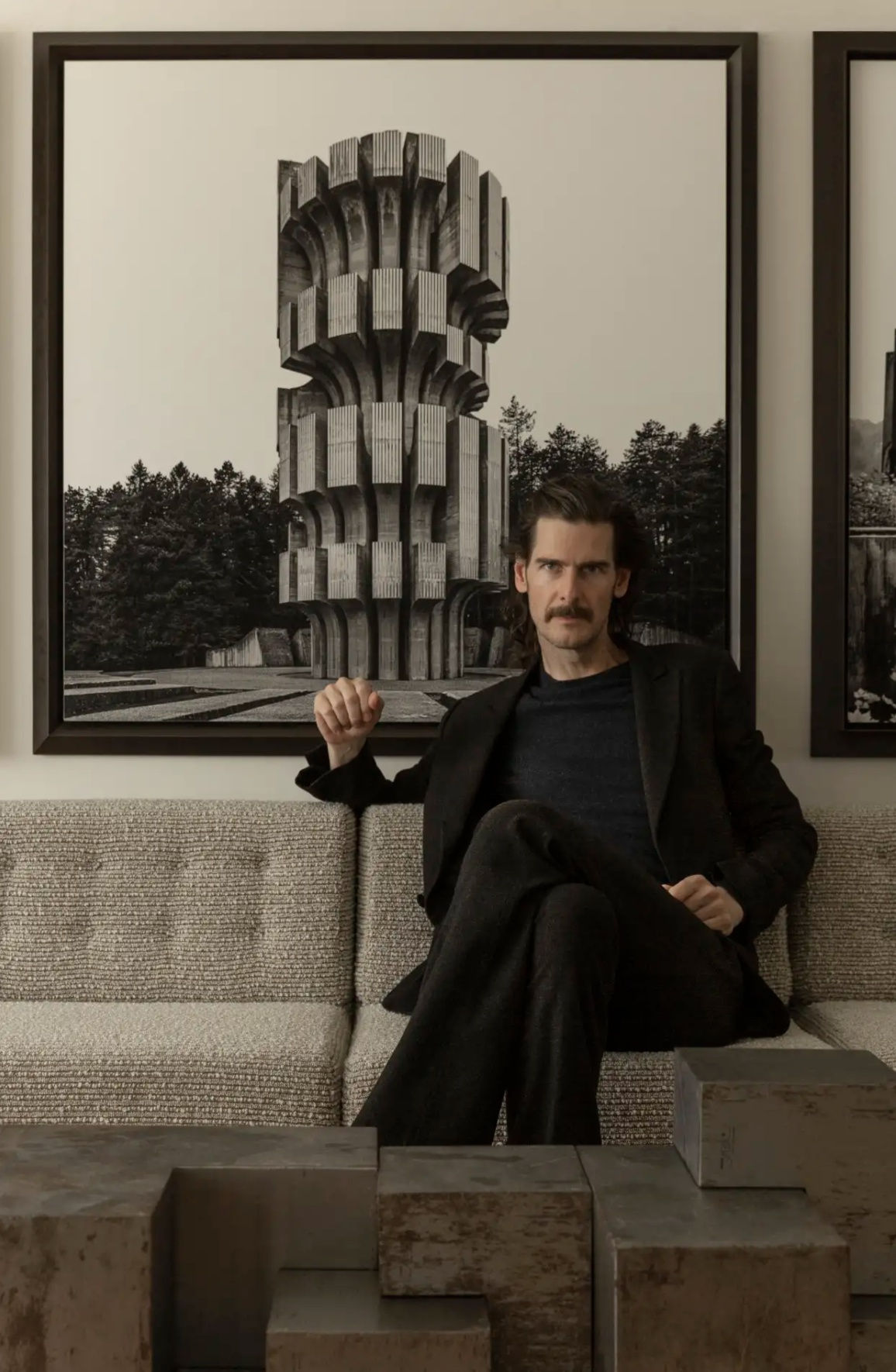 Don Cameron and his photograph "Kozara", of a monument in the former Yugaslavia designed by Dušan Džamonja (1972). "Capitole" sofa by Pierre Guariche (c1960); foreground sculpture "Costruttivo 74, Modulo L" by Nicola Carrino for Jabik edition.