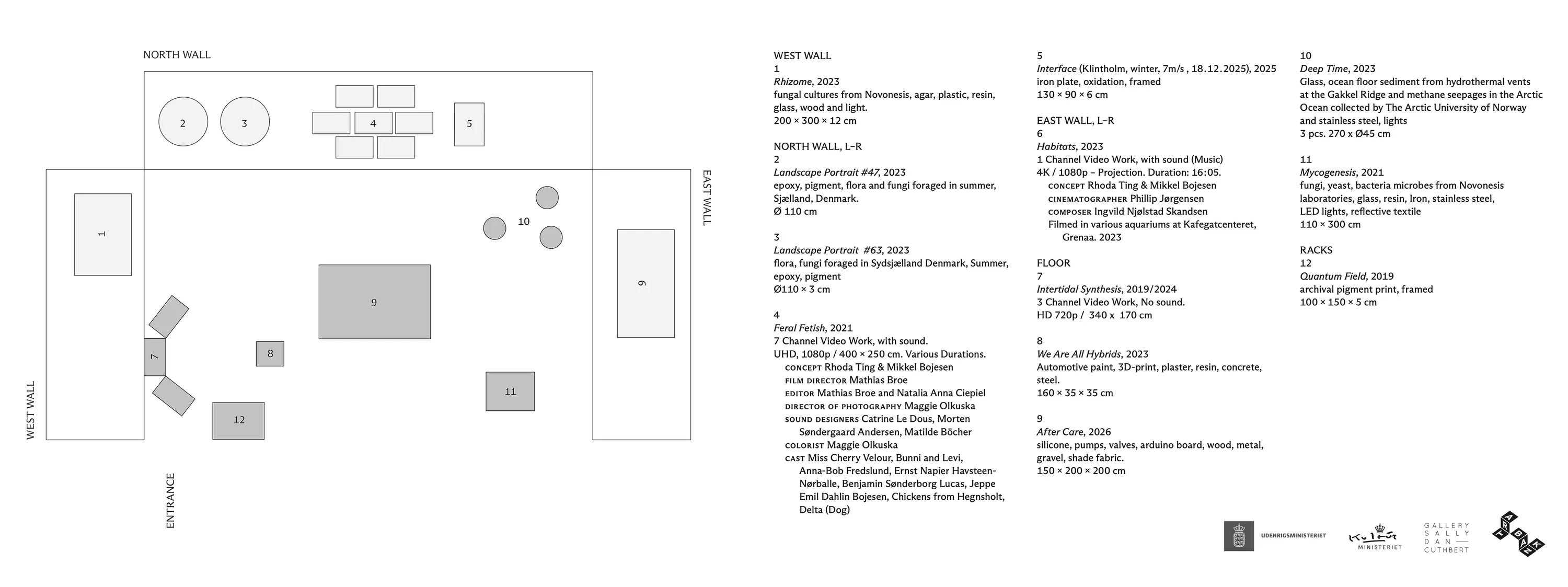 HYBRID FUTURES brings together sculptures, films, and living installations by Australian-Danish artist duo Rhoda Ting & Mikkel Bojesen. The exhibition explores how life emerges and evolves through entanglements between species, technologies, and environments. Developed between Denmark and Australia and informed by research in evolutionary biology, microbiology, and environmental DNA, the works consider how ecological transformation reshapes relationships between humans and other forms of life.Across the exhibition, speculative and observational approaches intertwine, moving between imagined futures and close attention to living processes already unfolding around us. Living systems take shape in MYCOGENESIS and RHIZOME, where fungi, bacteria, and yeast are grown in petri dishes and colonise suspended glass structures resembling brains, seeds, and organs. As branching mycelial networks spread across petri dishes and through sculptural vessels, they reveal forms of communication and growth that challenge anthropocentric ideas of intelligence and cognition.Questions of deep time and invisible ecosystems also surface throughout the exhibition. DEEP TIME presents glass towers containing sediment drawn from Arctic seabeds dating back 12,000 years, fused into molten glass, connecting viewers with life across geological time. MICROBIAL DWELLINGS, first presented at MPavilion, cultivates microbial cultures from local soil inside a large petri dish, making visible the microscopic ecologies often displaced by urban development. Other works focus on adaptation and ecological interaction across fragile environments. The film HABITATS documents marine animals encountering sculptural glass diatoms introduced into their environment, revealing moments of curiosity, adaptation, and cohabitation.In FERAL FETISH, a SCOBY — a Symbiotic Culture of Bacteria and Yeast used to produce kombucha travels through Danish landscapes that appear natural but are shaped by centuries of intensive agriculture. The work exposes tensions between romanticised images of nature and the industrial systems that produce them. Care and coexistence between biological and technological life forms emerge in AFTER CARE, where soft, gently moving robots breathe among red volcanic rocks sourced from Bacchus Marsh in Victoria. Borrowing its title from a term used in BDSM communities describing the practice of tending to one another after intense experience, the work reframes “aftercare” as a speculative ethic of responsibility toward technological life. The robots appear less like devices than companions, suggesting that new forms of care may be required as synthetic life becomesincreasingly present in the world. These robotic forms reappear in INTERTIDAL SYNTHESIS, a three-channel film that places them within coastal environments across Australia, Denmark, South Korea, and China. Set in working shorelines shaped by industry and ecological change, their slow breathing movements blur distinctions between the artificial and the alive.Material transformation is central to the exhibition’s methodology. In the LANDSCAPE PORTRAITS series, organic matter collected from local environments intra-acts with epoxy resin, forming compositions that register ongoing biological and chemical processes. INTERFACE similarly records traces left by oceanic forces on exposed industrial materials such as oxidising metal plates, allowing environmental conditions to act as collaborators in the production of form. The photographic work QUANTUM FIELD documents the artists’ land art composition of reconfigured salt crystals at Lake Crosbie in Murray-Sunset National Park, Australia. The work gives visible form to quantum entanglement, the principle that things once connected remain in relationship across any distance.Several works imagine possible trajectories of evolution and hybrid life. In WE ARE ALL HYBRIDS, a vividly coloured sculptural organism is generated from environmental DNA gathered across multiple species. Algorithmically combined through artificial intelligence, these forms propose speculative organisms that feel both strange and plausible, suggesting that evolution unfolds through continuous exchange rather than isolated development.Taken together, the works propose a shift away from narratives of human control toward an understanding of life as fundamentally relational. HYBRID FUTURES presents a world shaped through processes of collaboration, co-evolution, and multi-species entanglement, where the boundaries between nature and culture, the natural and the synthetic, and the pure and the feral begin to dissolve.HYBRID FUTURES is co-curated by Sofie Dirks Gottlieb (Copenhagen) and Sally Dan-Cuthbert (Sydney).HYBRID FUTURES is supported with funds from a joint grant under the Danish Ministry of Culture and the Ministry of Foreign Affairs of Denmark.